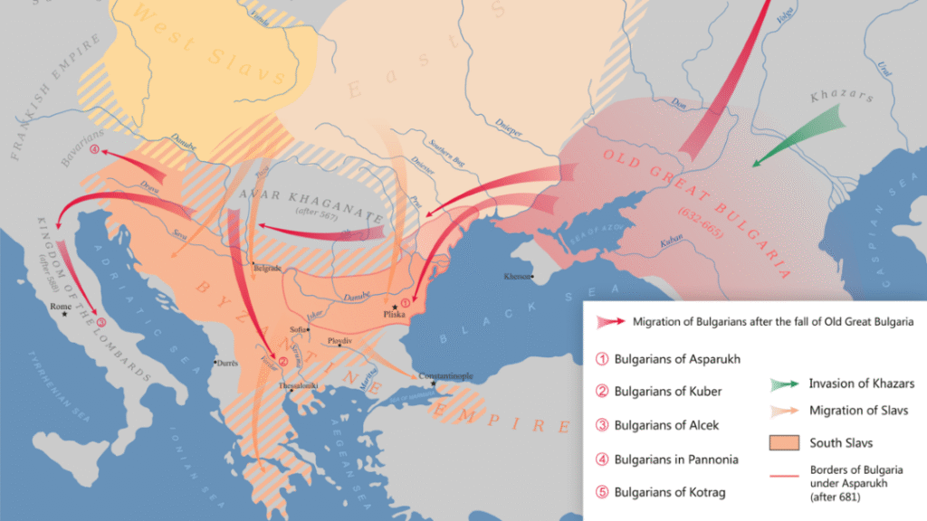 „У том смислу, историографија је често предлагала хипотезе о идентитету Хорвата и Кубрата и бугарском пореклу Хрвата(…) Нијансираније објашњење за ове паралеле недавно је понудио Л. Маргетић. Према овом истраживачу, под каном Кубратом/Кроватом, не само да су се Бугари ослободили аварске власти, већ се Кубратов/Кроватов политички утицај проширио и унутар самог Аварског каганата, обележен успостављањем нове војне елите – „Кроватијана“ (Кроватовог народа). Они су одржали своје позиције до 670-их, а затим су потиснути на периферију каганата новим таласом имиграната са истока.